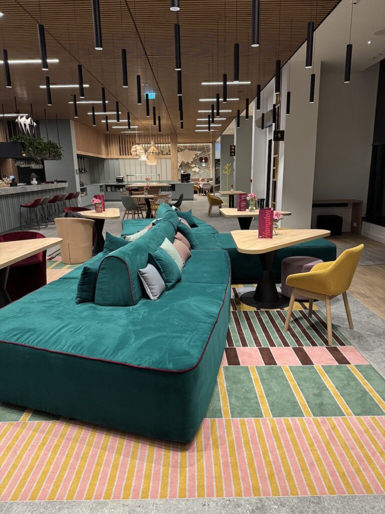 The lobby has many comfortable seating options, some equipped with power outlets for longer stays. Overall, I really like this new Hampton concept.