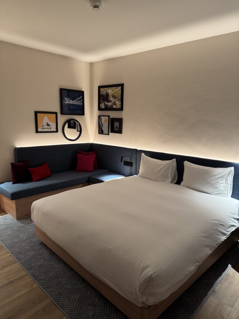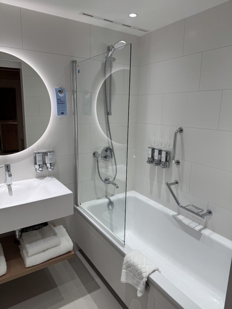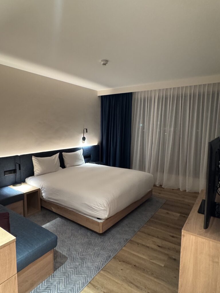Anyone arriving at the airport should walk left, past the information desk, cross the street once, and head toward the parking lot. From there you can already see the Hampton logo and it’s just a few minutes to the hotel. Unfortunately, this crossing is (still) not covered, so even this short distance isn’t particularly pleasant in the rain.